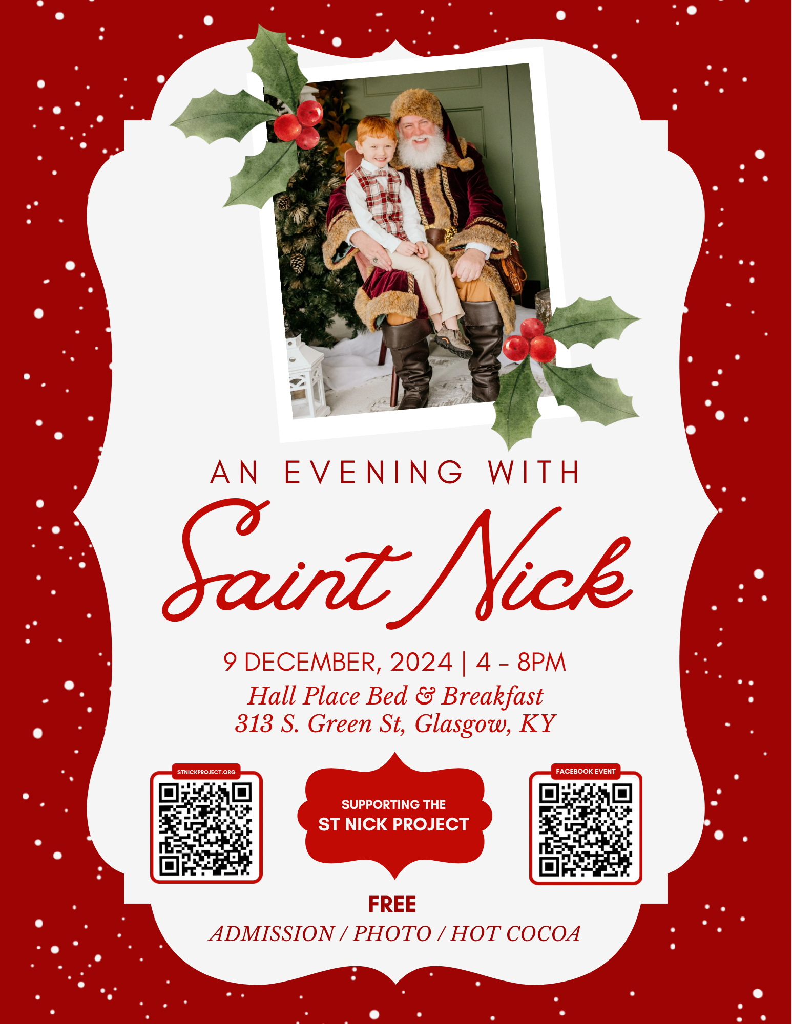 π Join us between 4-8PM next Monday evening at Hall Place B&B for an evening of Yule Tide cheer with Olβ Saint Nick in support of the ST NICK Project which aims to help Santa provide Christmas visits & blessings to as many families in need as possible! π